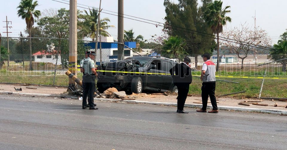 Elementos de seguridad observando la camioneta que tumbo un poste en Tampico