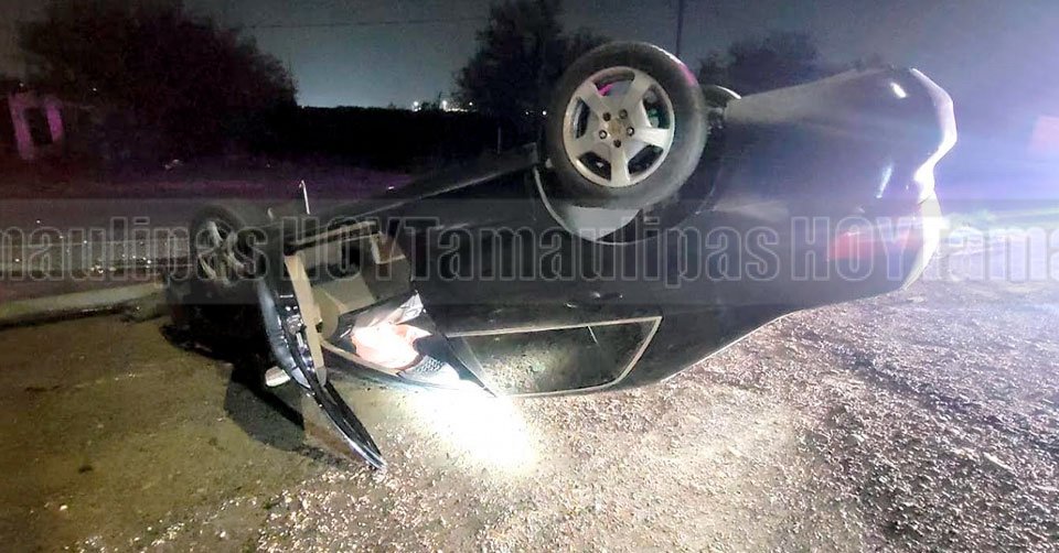 El automóvil Honda Accord modelo 2000 terminó con las llantas hacía arriba en la Carretera Aeropuerto, frente a la colonia La Joya en Nuevo Laredo