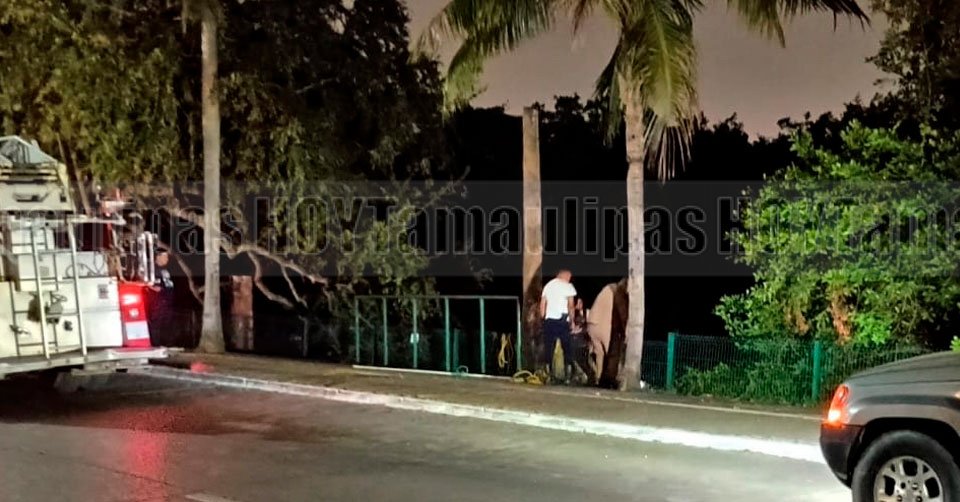 Momento en el que personal del Cuerpo de Bomberos capturan al enorme cocodrilo que paseaba por el Boulevard Perimetral en Tampico, frente al Motel Juancho