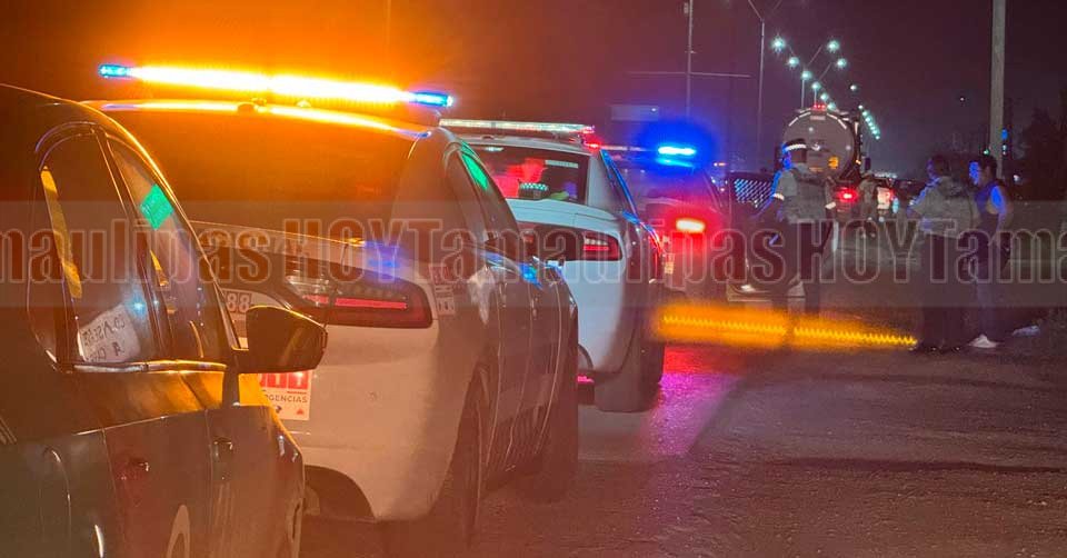 Patrullas de la Dirección de Tránsito y Vialidad en el sitio donde una camioneta Ford Ranger fue impactada contra una pipa en Matamoros
