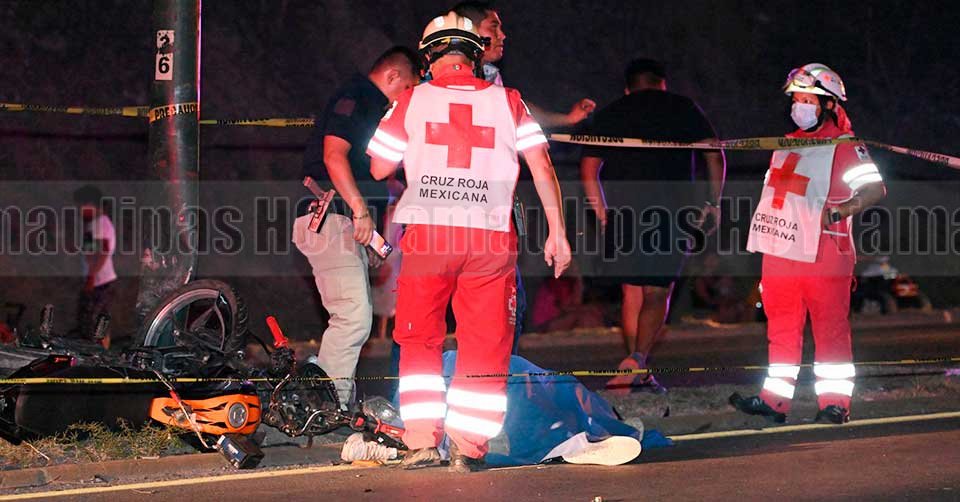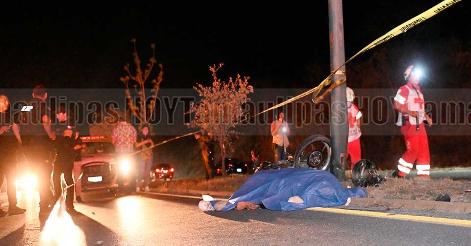 Paramédicos de Ciudad Victoria y autoridades junto al cuerpo del joven motociclista que perdió la vida