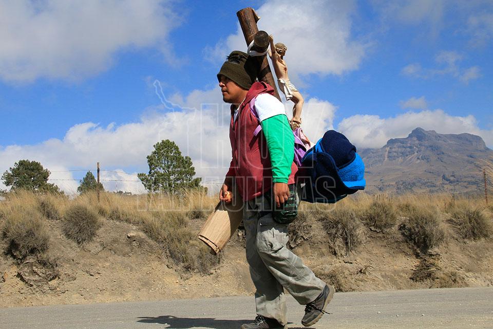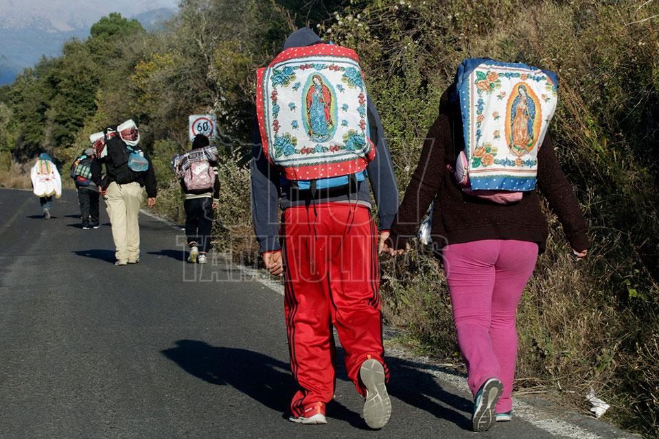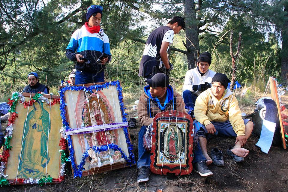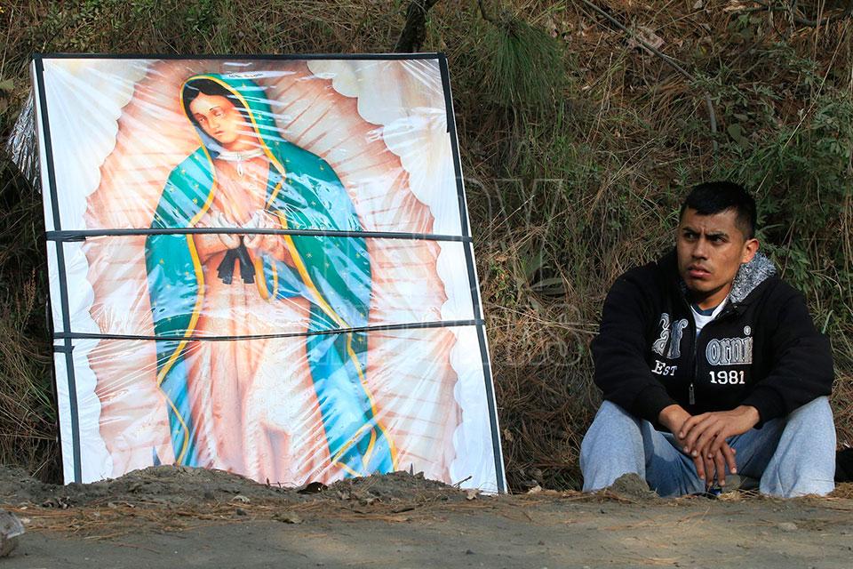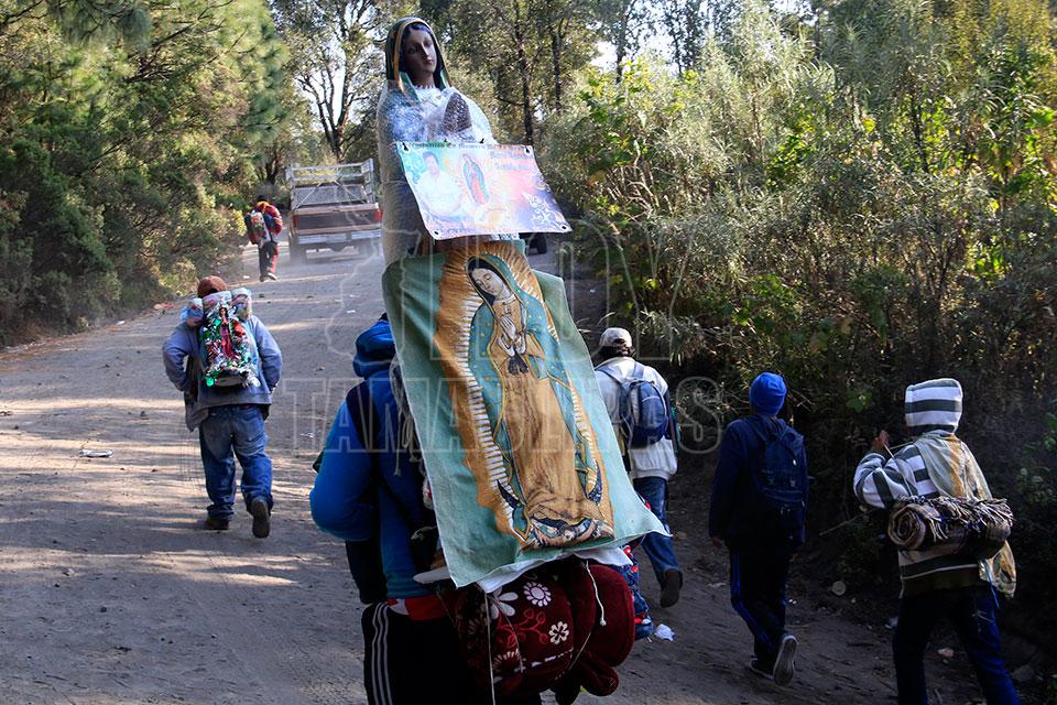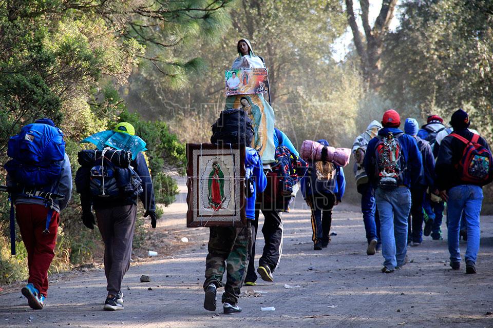 Peregrinos Guadalupanos acompañados de sus imágenes de la Virgen de Guadalupe cruzan el volcán Popocatépetl y el Iztaccíhuatl a la altura de Paso de Cortez para llegar en los próximos días a la Basílica y venerar a la Virgen del Tepeyac