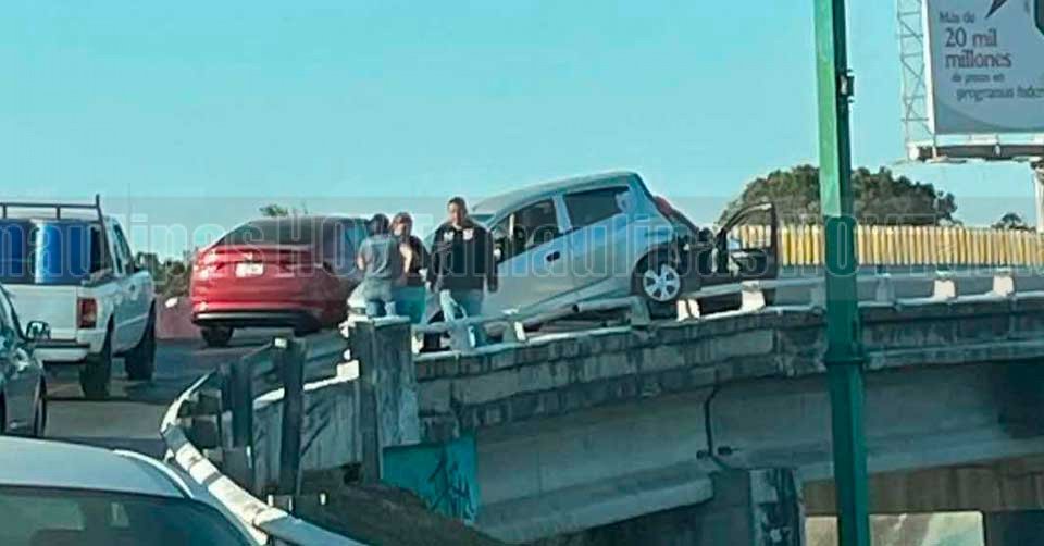 El automóvil Chevrolet Spark color gris plata estuvo a punto de caer del puente en el paso a desnivel Aeropuerto de Tampico