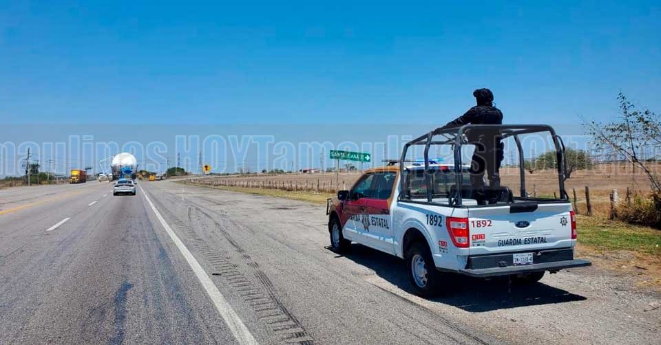 Patrulla de la Guardia Estatal a orillas de la carretera dando seguridad en el traslado de calderas rumbo a Nuevo Len