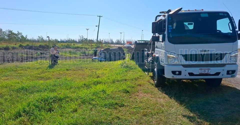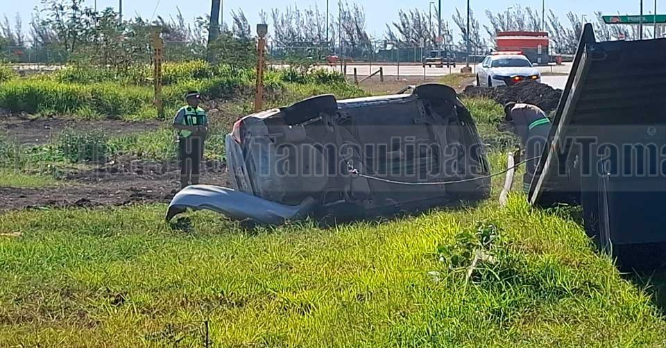 El automvil Nissan de color gris qued volcado a un costado del llamado "puente roto" en Altamira, a donde lleg una gra para remolcarlo