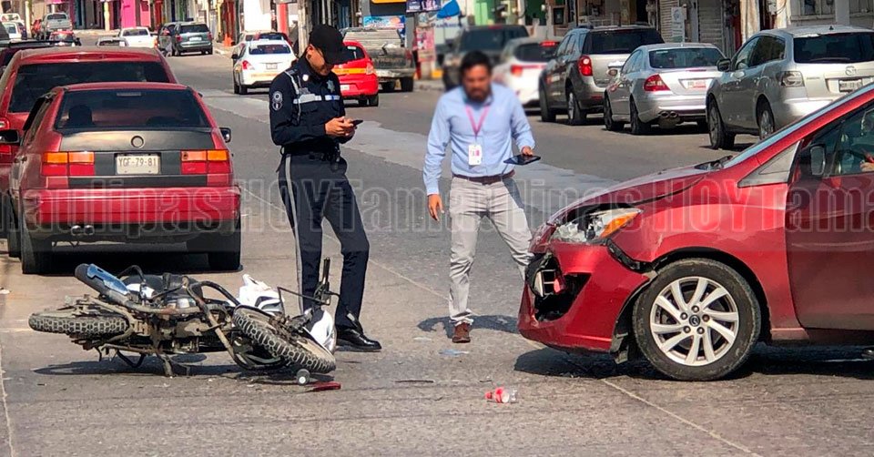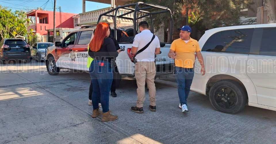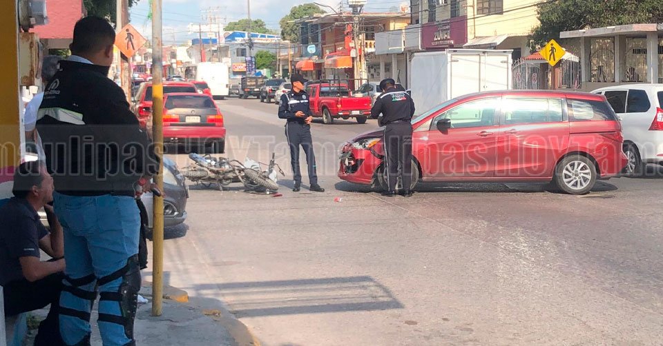 Agentes de Tránsito dialogando con una persona junto a la mini-van de color rojo que terminó con daños en la parte de enfrente donde se impactó el motociclista en la colonia Laguna de la Puerta en Tampico