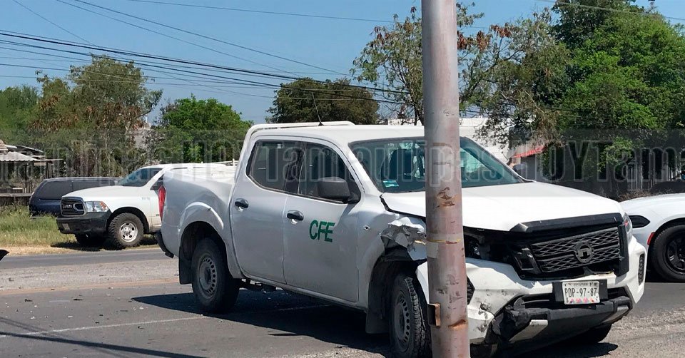 La camioneta Nissan con logos de la CFE terminó con daños en la parte de enfrente, por el lado del copiloto, tras el impacto de un auto Sedan Toyota en la salida a Matamoros en Victoria