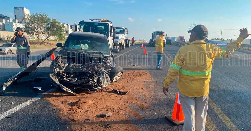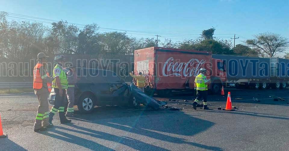 Automóvil que quedó destrozado de la parte frontal al ser embestido por el un camión en Tampico