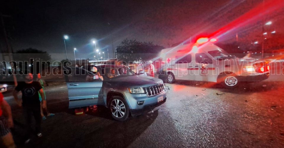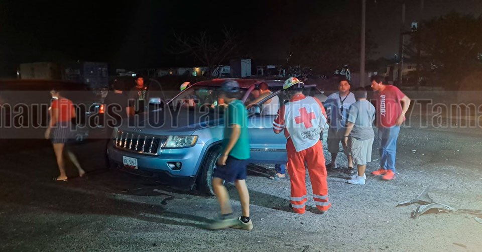 Ambulancia de la Cruz Roja cerca de la camioneta Jeep Grand Cherokee color azul en la que viajaba una pareja y que participó en el choque de la Tampico-Valles