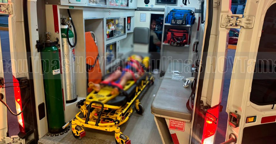 Menor de edad en la ambulancia de la Cruz Roja para ser trasladada a un centro hospitalario tras el accidente registrado en la carretera a la Playa Bagdad en Matamoros