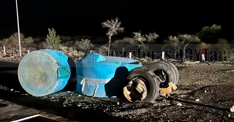 Tanques Rotoplas que resultaron dañados tras el choque de un tráiler contra una caseta de cobro en construcción a la altura del kilómetro 38 de la Rumbo Nuevo