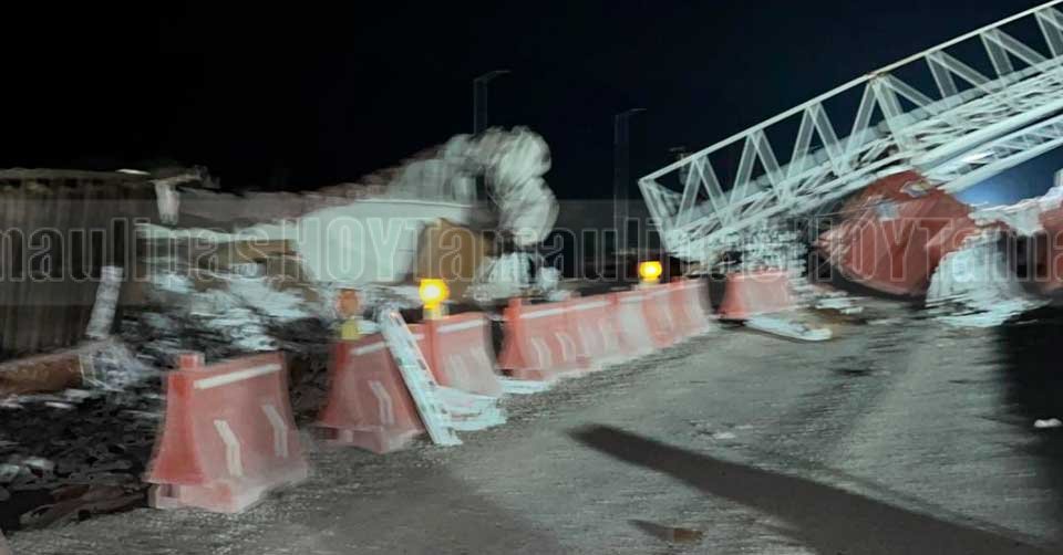 Estructuras dañadas tras el choque de un tráiler contra una caseta de cobro en construcción a la altura del kilómetro 38 de la Rumbo Nuevo en Jaumave