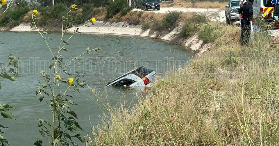 Unidades de emergencia en el sitio donde una camioneta Chrysler Pacífica de color gris, con placas del Estado de Texas, terminó en el canal Rodhe