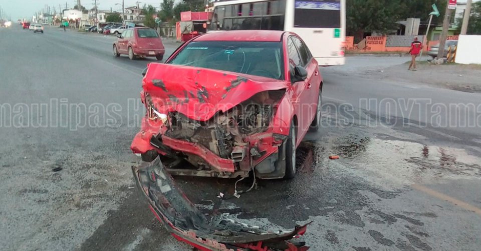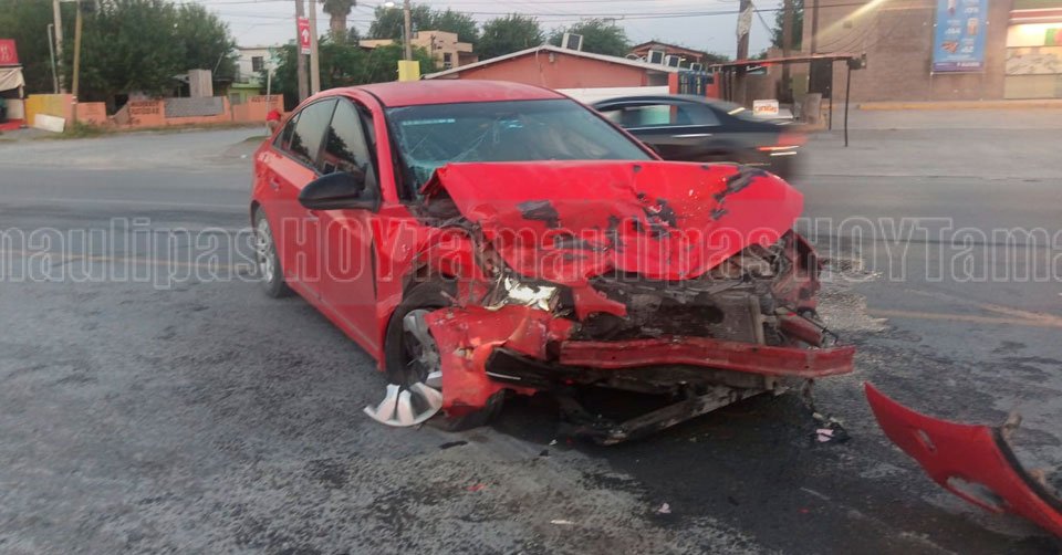 El automóvil Chevrolet Cruze rojo terminó con severos daños en la parte de enfrente tras el choque con un Nissan Sentra verde en la carretera a San Fernando