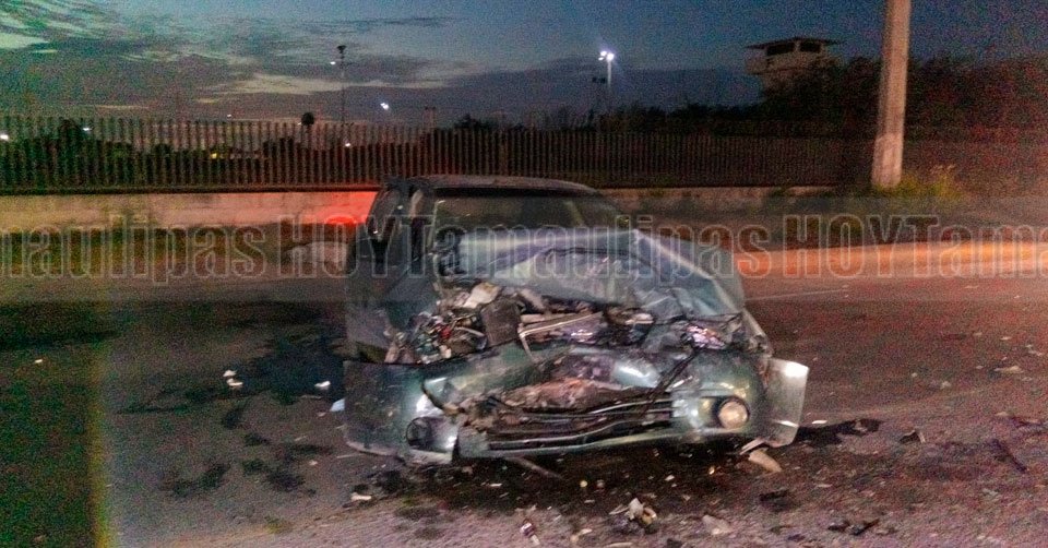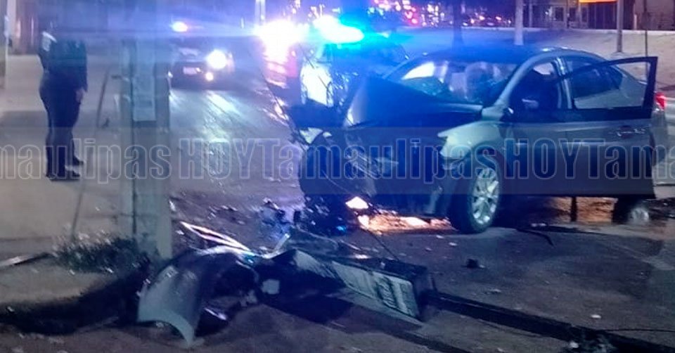 El automóvil Nissan Versa color gris terminó con severos daños tras el impacto con el poste de concreto de la CFE en Tampico