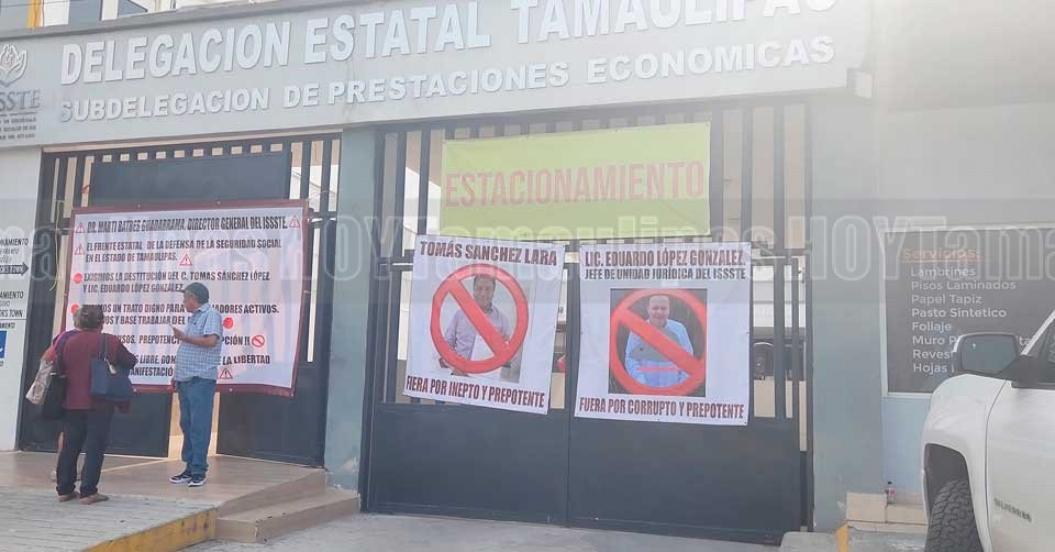 Lonas colocadas por los jubilados y pensionados federales en el exterior de la Subdelegación del ISSSTE en Ciudad Victoria