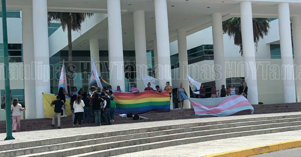 Integrantes de la comunidad LGBT+ manifestándose la mañana de este martes en las escalinatas del Congreso de Tamaulipas