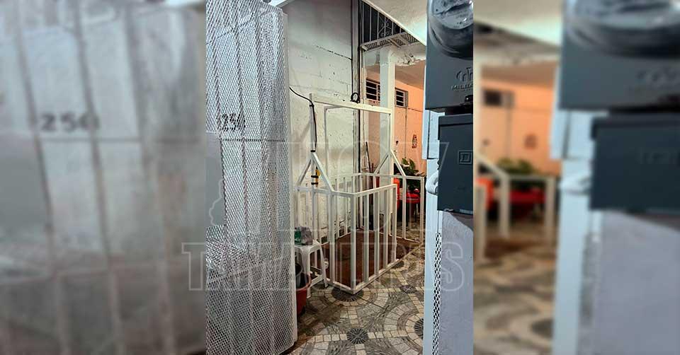 Elevador casero de metal pintado de blanco, utilizado para descender del segundo piso, antes del desplome que dejó heridos