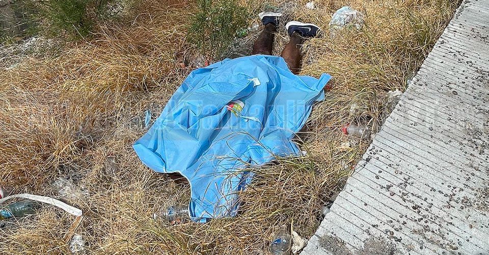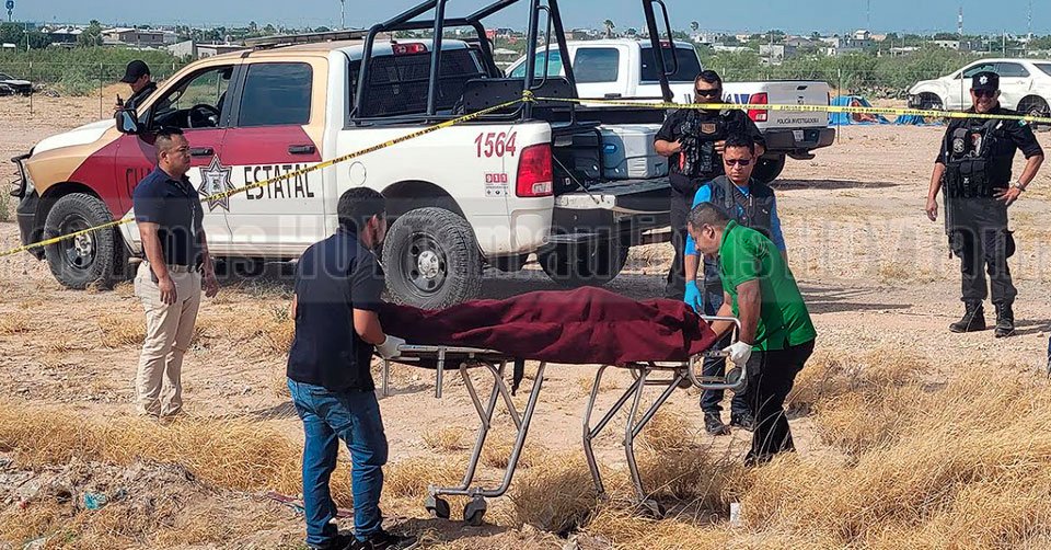 Agentes de la Policía Investigadora en el sitio donde fue localizado el cuerpo sin vida de un hombre cerca de la entrada a la colonia Los Artistas