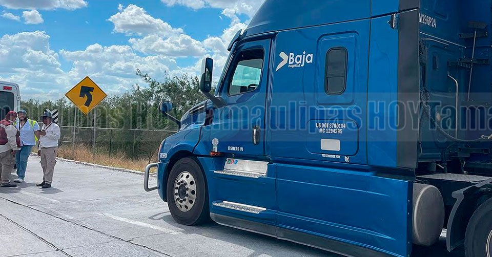 Este es el tráiler de color azul que conducía el trailero que se sintió mal y descendió del mismo en el Libramiento Mex 2, al poniente de Nuevo Laredo, perdiendo la vida a un costado