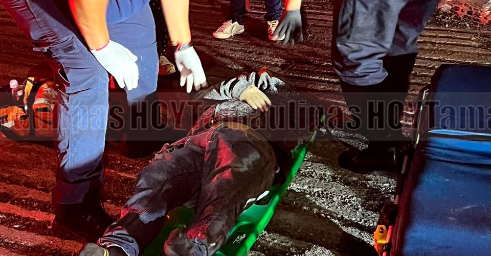 Socorrista auxiliando al motociclista que resultó lesionado al impactarse contra la valla de concreto en la carretera Reynosa-Río Bravo