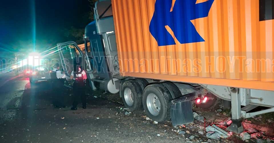 Elementos de Tránsito observando el tráiler que resulto con daños luego de chocar en la carretera Rumbo Nuevo