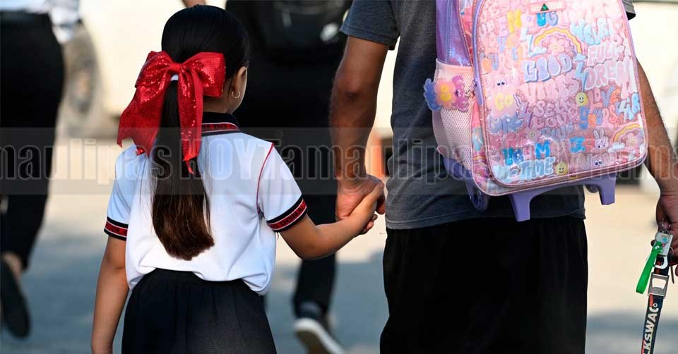 Niña vestida con su uniforme agarrada de una de las manos de su padre en este inicio de clases del ciclo escolar 2025-2026 en una escuela de Ciudad Victoria
