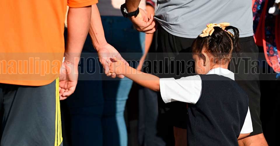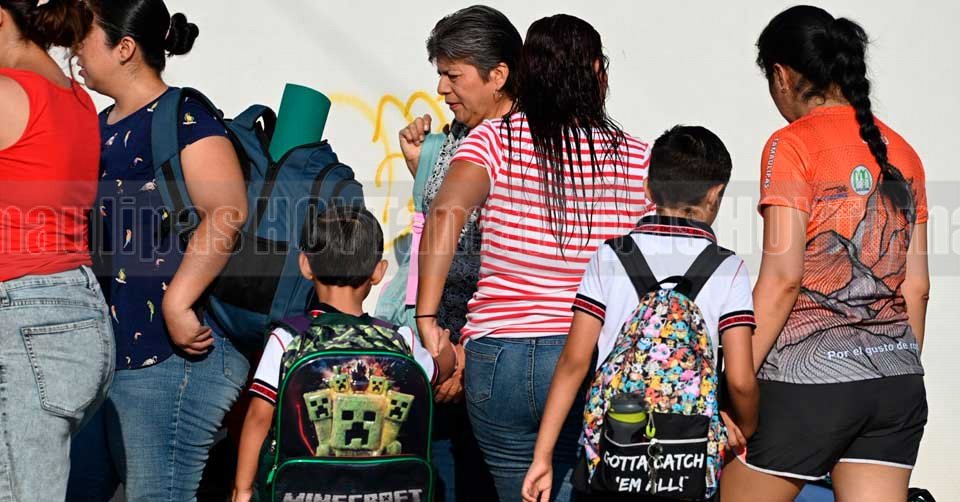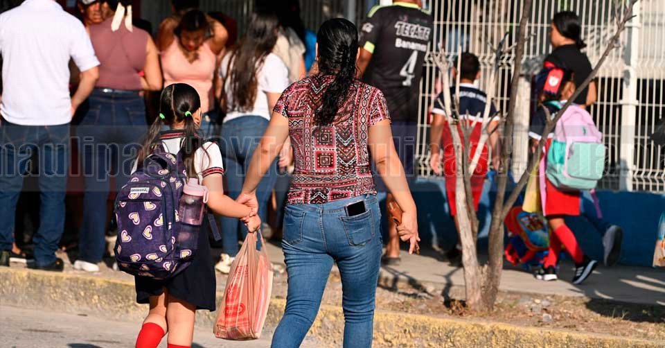Menores de edad con sus uniformes y mochilas agarrados de las manos de sus mamás en este inicio de clases del ciclo escolar 2025-2026 en una escuela de Ciudad Victoria