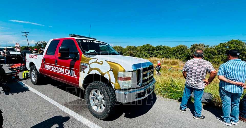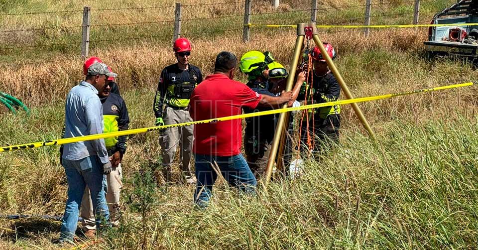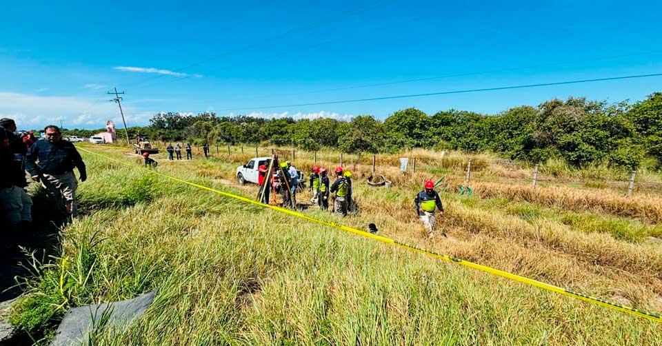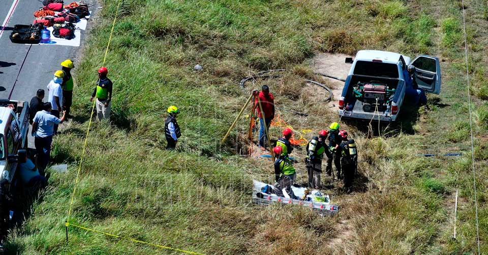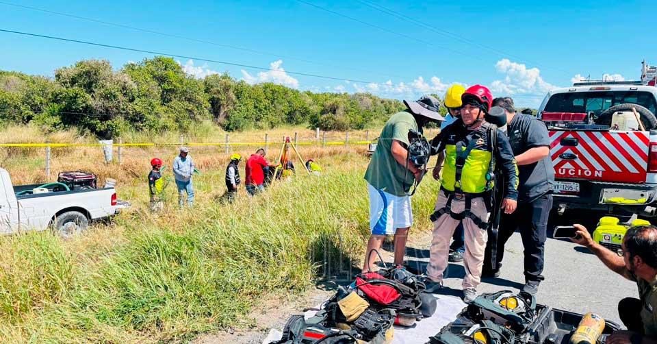 Elementos de Protección Civil de Padilla y socorristas del Centro Regulador de Urgencias Médicas (CRUM) en el rescate de trabajadores que quedaron atrapados en una alcantarilla