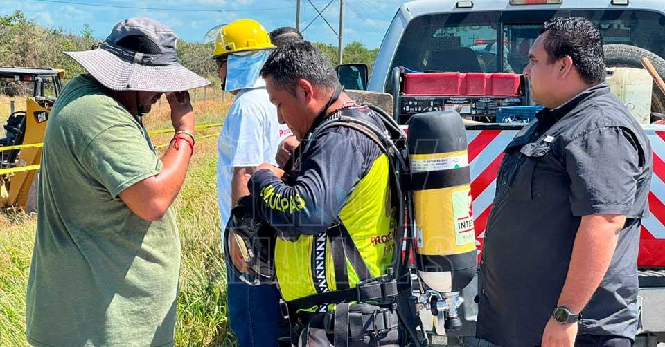 Elementos de PC de Padilla y socorristas del Centro Regulador de Urgencias Médicas (CRUM) en el rescate de trabajadores que quedaron atrapados en una alcantarilla