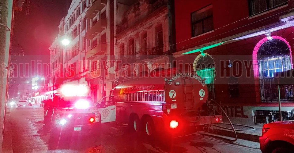 Camión del Cuerpo de Bomberos y brigadistas voluntarios atendiendo el incendio en un edificio de la zona centro de Tampico, a lado del conocido Hotel Mandarín