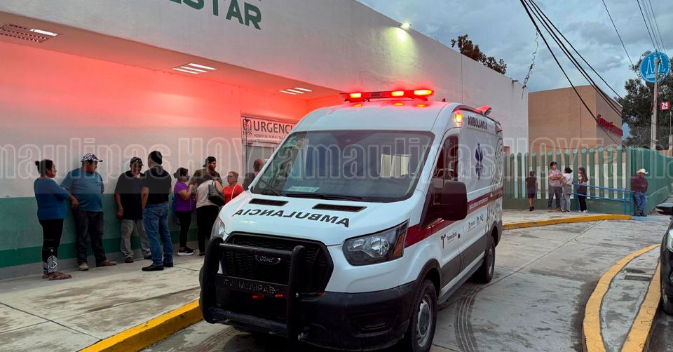Ambulancia de Protección Civil en la entrada de urgencias del Hospital del Seguro Social (IMSS) en Tula, a donde ingresó el hombre que se cayó de un segundo piso