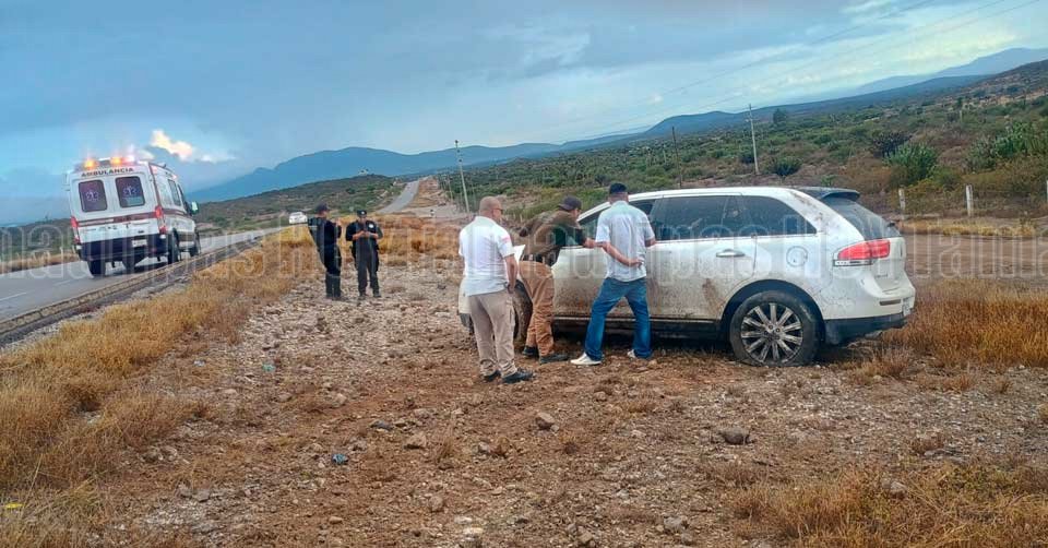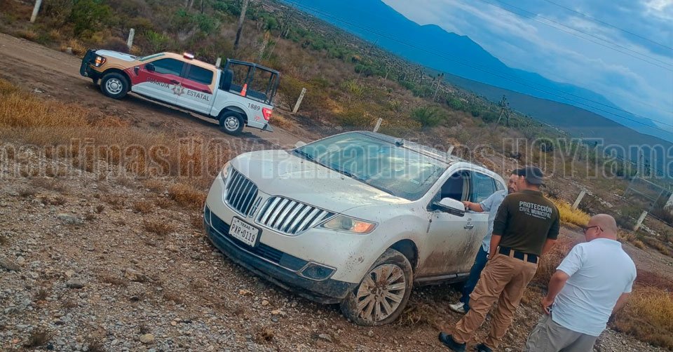 Elemento de Protección Civil del municipio de Tula dialogando con el conductor del Lincoln blanco que derrapó debido a la ponchadura de un neumático