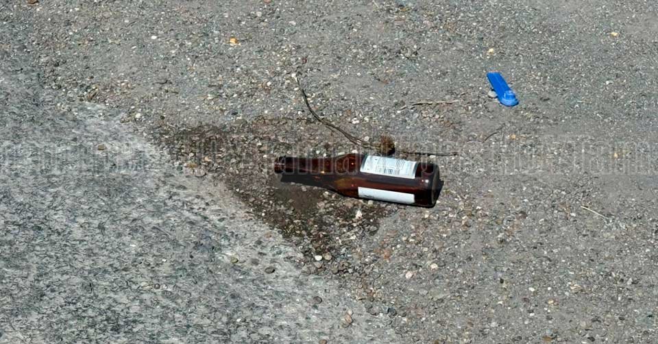 Botella de cerveza sobre el pavimento en el sitio donde una camioneta terminó volcada a la altura del kilómetro 13 de la carretera Ribereña, en el tramo de Estación Anzaldúas
