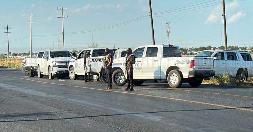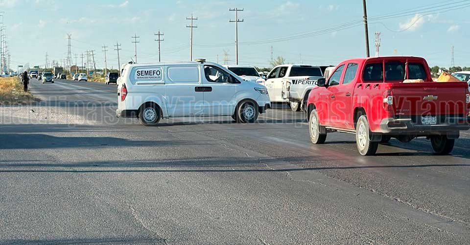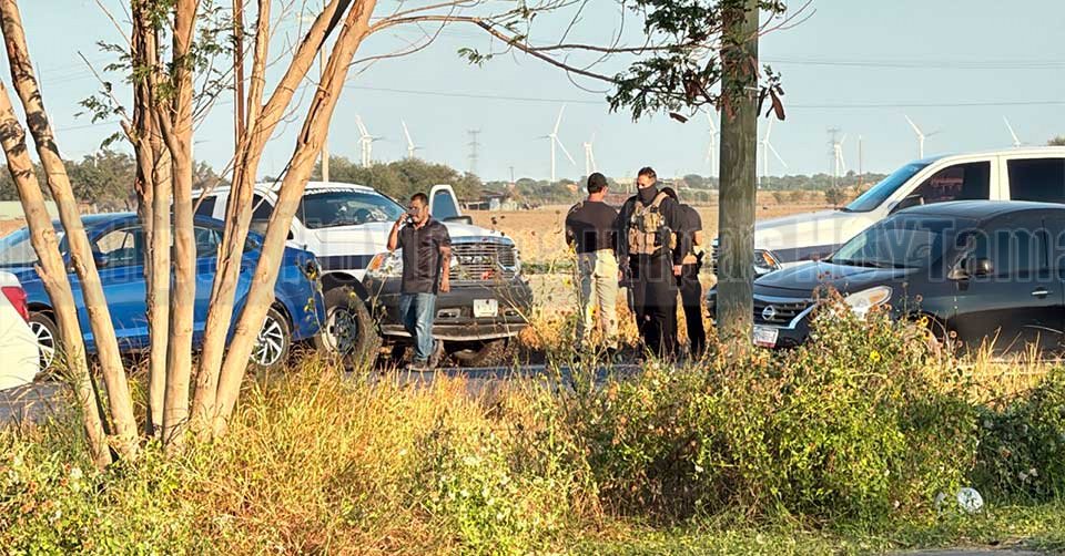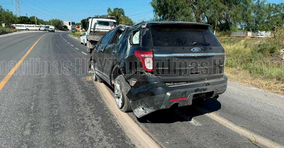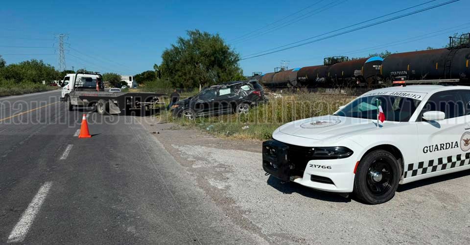 Patrulla de la Guardia Nacional en el sitio donde una camioneta terminó volcada a la altura del kilómetro 13 de la carretera Ribereña, en el tramo de Estación Anzaldúas