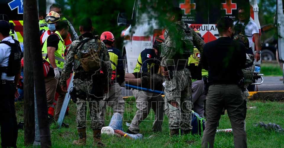 Elementos del Ejército lesionados, atendidos en el sitio tras el volcamiento del camión blindado, custodiado por soldados