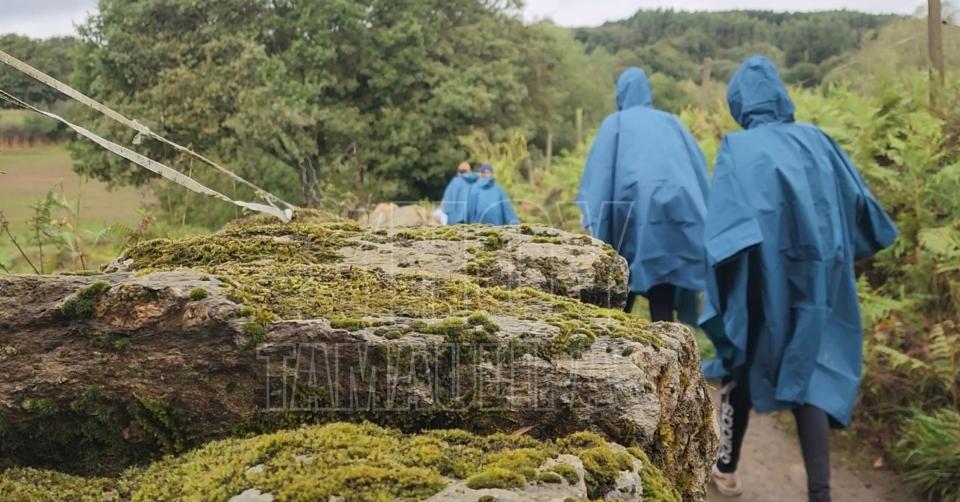 Peregrinos rezan el Rosario mientras avanzan bajo el cielo gris. Sus voces se entrelazan con la lluvia, recordando que este viaje se hace con los pies… pero también con el corazón.