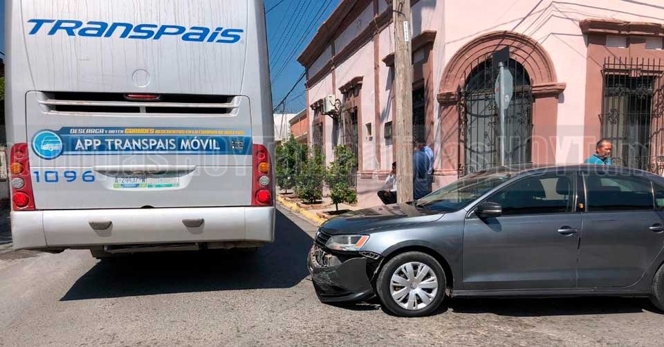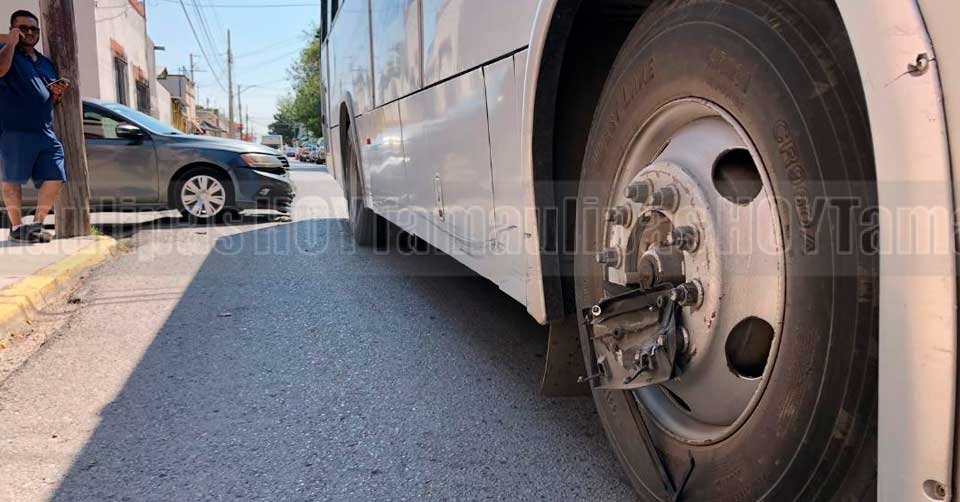 El automóvil particular impactado contra el neumático de un autobús de la empresa Transpaís en el cruce del Cuatro Matamoros en Ciudad Victoria
