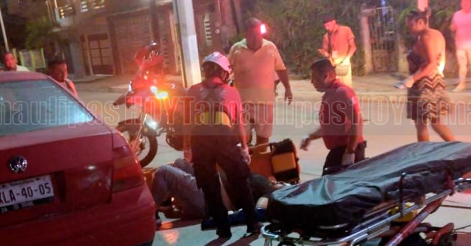 Paramédicos brindándole los primeros auxilios a la mujer que resultó lesionada tras derrapar de su moto en El Mante
