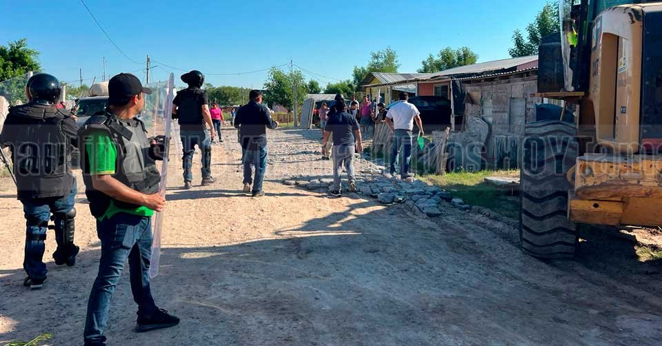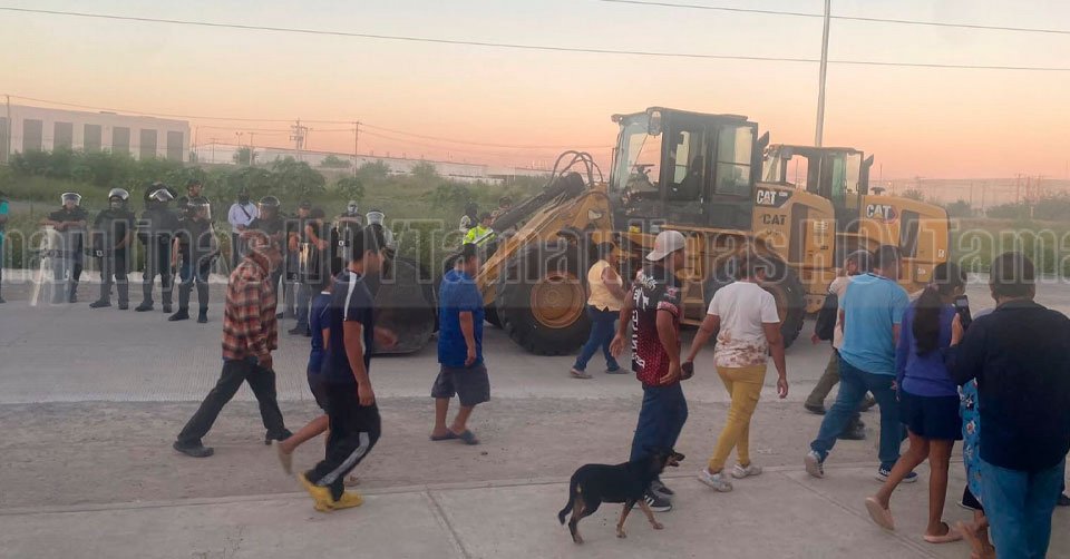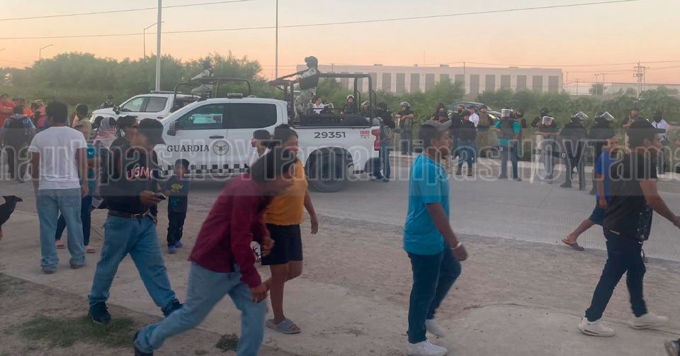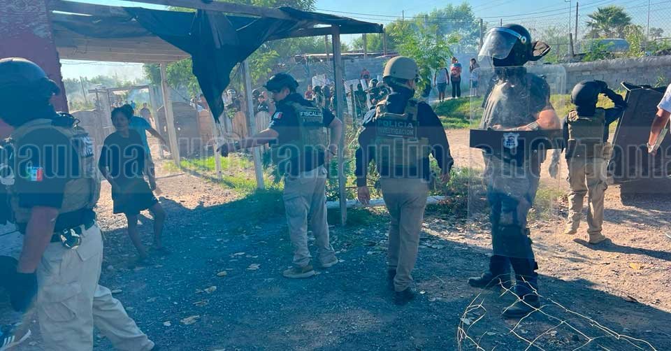 Elementos de la Fiscalía durante un enfrentamiento con habitantes de la colonia 23 de Marzo que bloquearon la circulación en el boulevard Colosio de Reynosa
