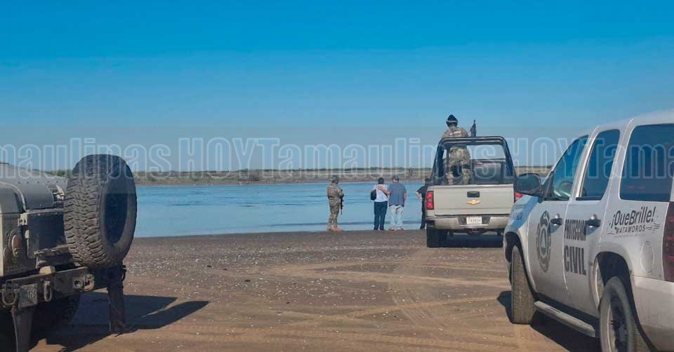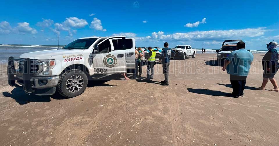 Elementos de Seguridad junto a la esposa de un hombre que se ahogó en playa Bagdad