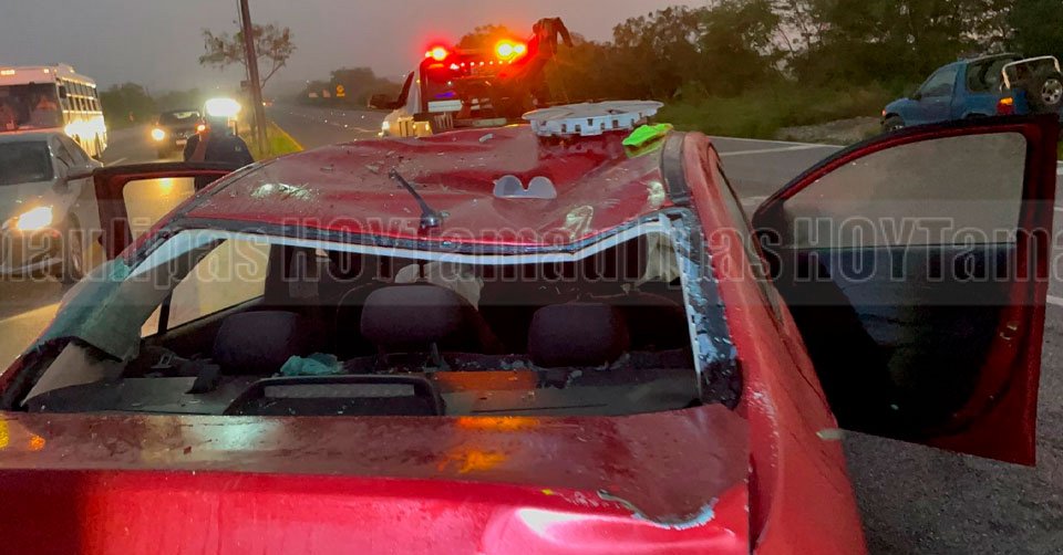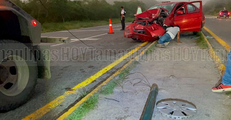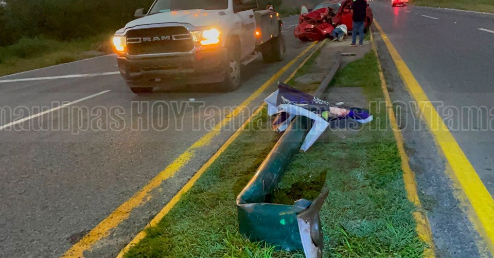 El automóvil de color rojo terminó con severos daños en la parte del capacete y del frente tras el impacto con una luminaria y volcar en el libramiento Naciones Unidas en Ciudad Victoria