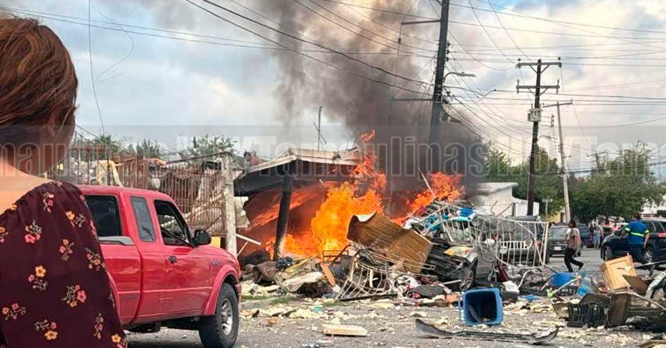 Escombros regados en una calle de la colonia Infonavit al sur de Nuevo Laredo, donde se registró una explosión por fuga de gas; socorristas trabajan para sofocar las llamas