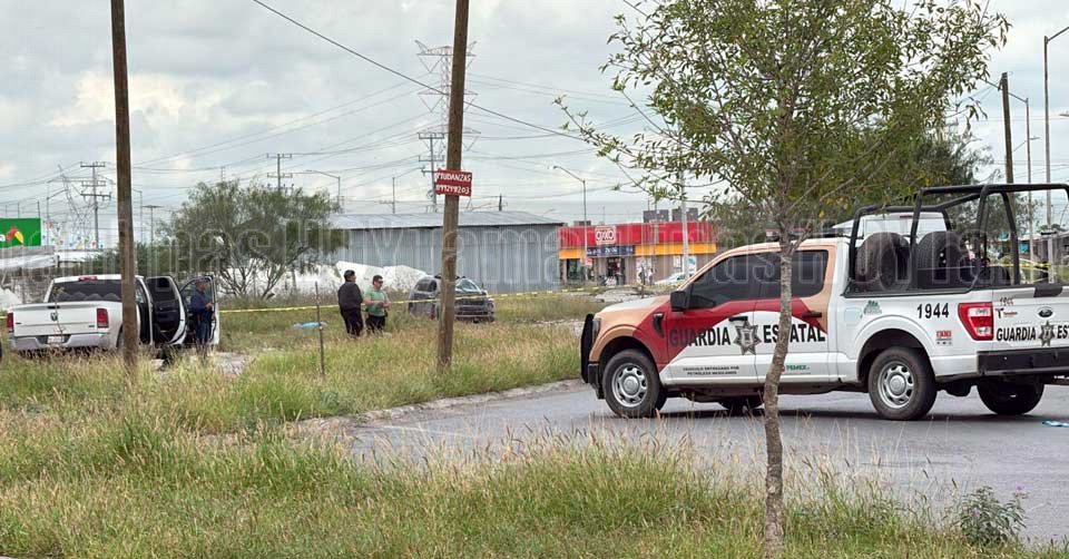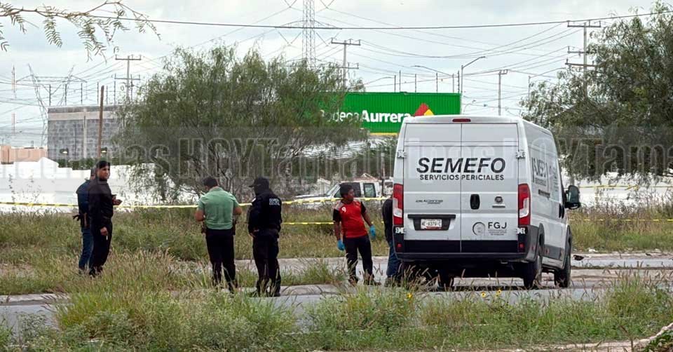 Personal de la Fiscalía junto al cuerpo sin vida de una persona que fue cubierto con una sábana azul en Reynosa