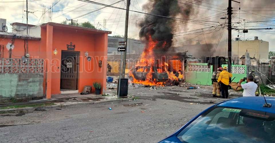 Camioneta ardiendo en llamas luego de la fuerte explosión en una vivienda de Nuevo Laredo