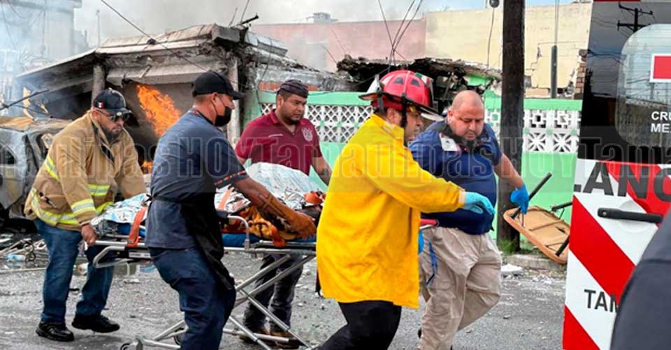 Paramédicos y Bomberos trasladas en camilla a una persona lesionada luego de una fuerte explosión en una casa de Nuevo Laredo