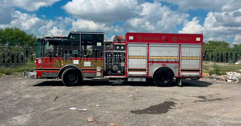Camión de Bomberos en el lugar donde una persona terminó lesionada al explotarle una pila en Matamoros