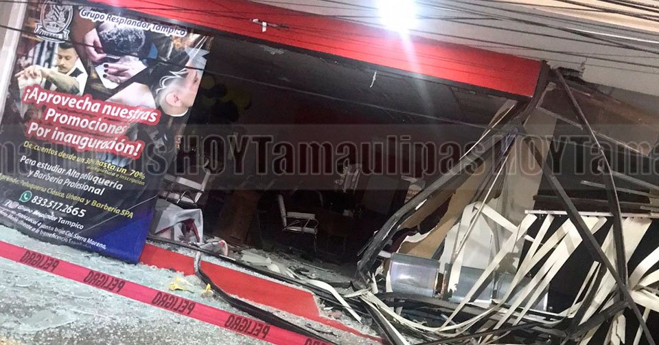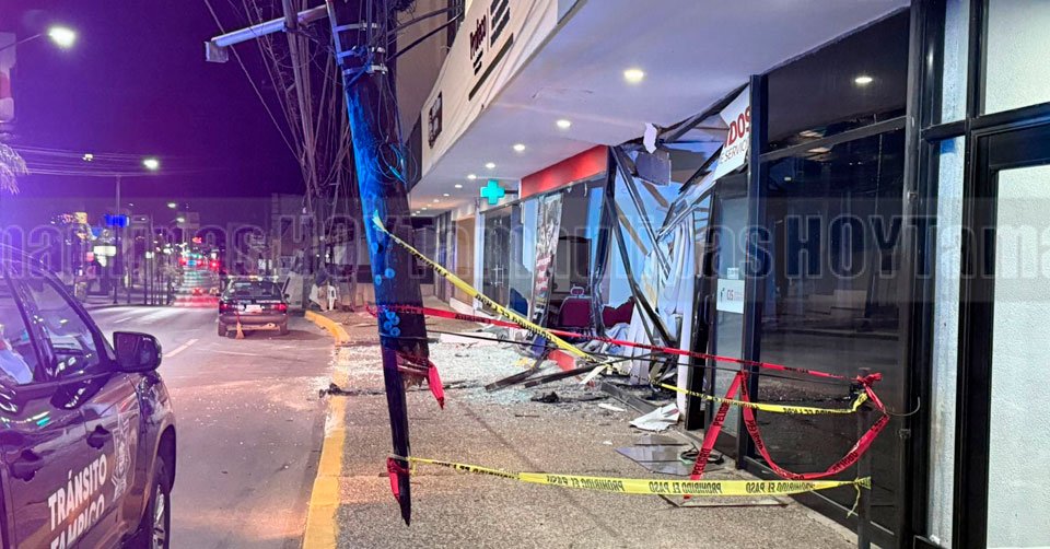 Daños ocasionados por un automovilista a un poste de Telmex derribado y varios negocios del edificio Melik en la ciudad de Tampico