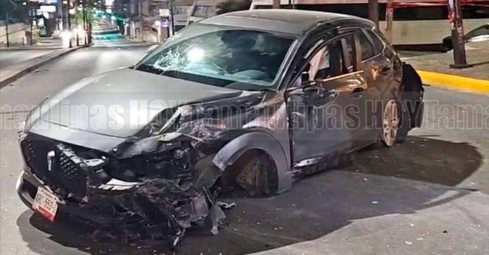 El automóvil Mazda color negro que conducía un joven terminó con severos daños en la parte de enfrente del lado del piloto tras el accidente en la Avenida Hidalgo en Tampico