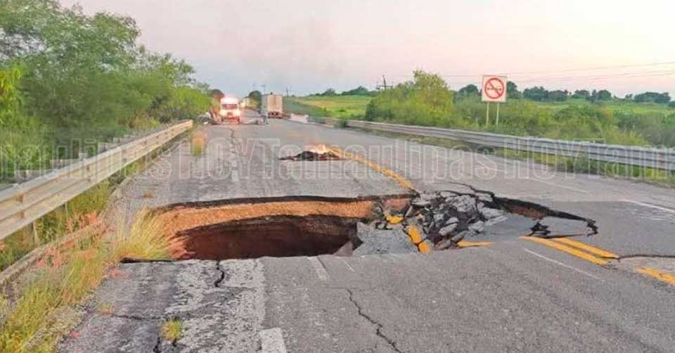 Enorme socavón que se formó en el kilómetro 110 de la carretera Soto la Marina–Aldama